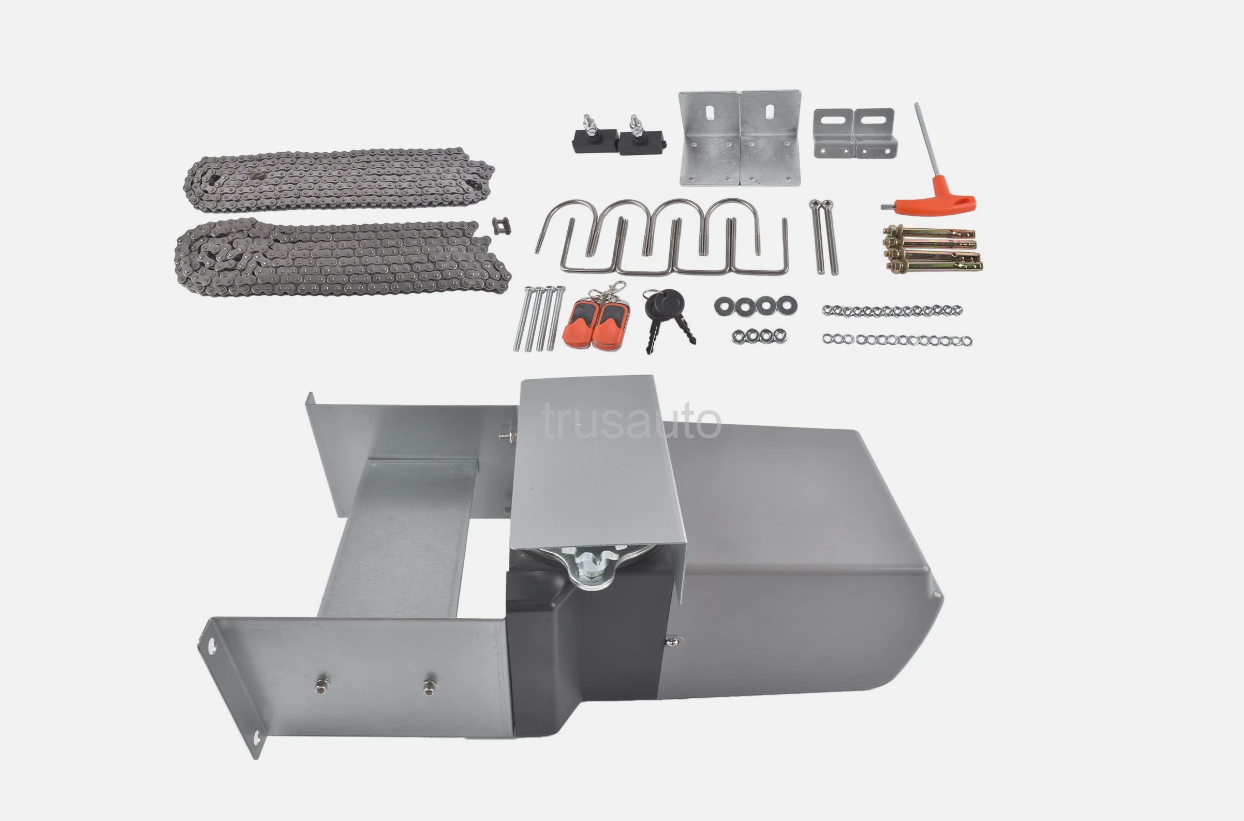 As pics shown 1 X Sliding Gate Opener 1 X 20 ft Chain (Can be split into 2 x 10 ft Chains) 2 x Remote Controls (Not Include Battery) 2 x Manual Release Keys 1 x Set of Mounting Hardware 1 x Set Installation Parts 1 x Manual