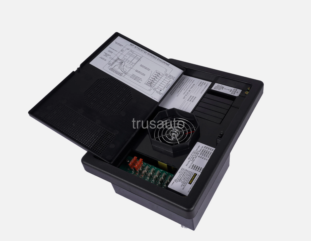 The WF-8735-AD converter/charger is compatible with various RVs, trailers, and campers. The cooling fan only runs when needed to ensure quiet operation.
