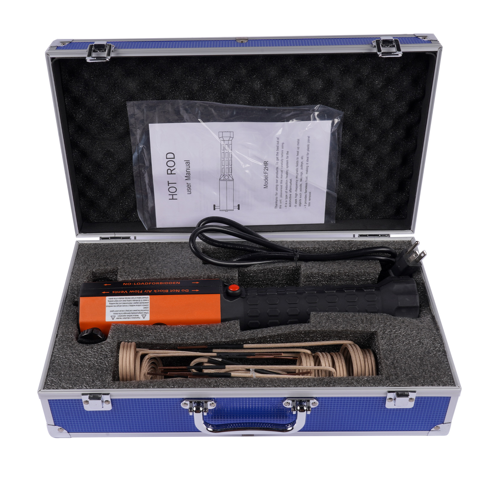 This professional 1200W flameless induction heating tool comes complete with 10 interchangeable coils, a durable blue aluminum carrying case, and a protective packaging box for safe storage and transport.