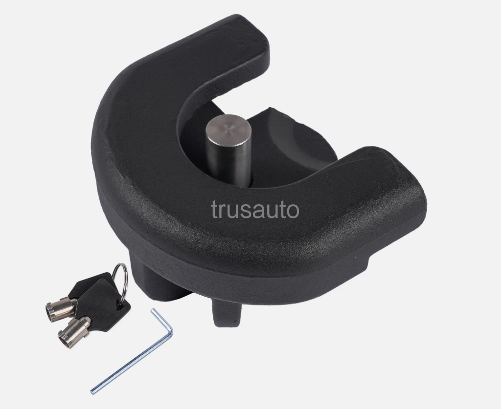 This heavy-duty 2-inch trailer coupler lock is built to provide maximum security for your boat trailer, RV, or utility trailer. Constructed from rugged cast iron with a corrosion-resistant black painted finish, it features a solid stainless steel locking pin that resists cutting, prying, and bolt cutter attacks. Equipped with an anti-pick and anti-copy key system, it offers superior protection against unauthorized access and theft. Designed as a direct replacement for 2-inch trailer couplers, it is ideal for both short-term transit and long-term parking in outdoor lots, campgrounds, and storage facilities.